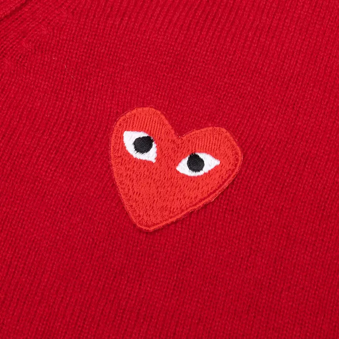 The Comme des Garcons PLAY Red Heart Knit Cardigan Sweater is a high quality piece that combines Japanese design with modern streetwear. This red cardigan features the iconic PLAY heart logo with eyes embroidered on the chest, making it a distinctive piece from one of the most respected brands in fashion.