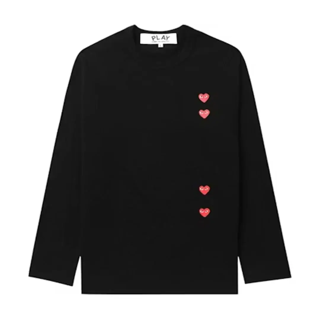 The Comme des Garçons PLAY Vertical 4 Heart L/S Tee in Black is a standout piece that blends minimalist style with the brand’s signature playful design. This black long-sleeve t-shirt features four vertically aligned red hearts with the iconic bug-eyed expression, placed neatly along the left side for a subtle yet striking aesthetic. The classic black color provides a timeless base, while the bold red hearts bring a pop of color to this versatile piece.
