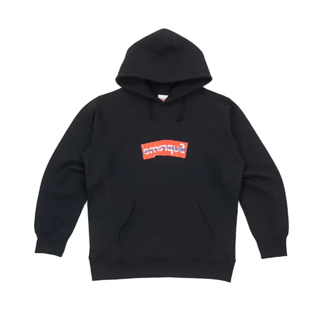 Own a piece of streetwear history with the Supreme x Comme des Garcons SHIRT Box Logo Hooded Sweatshirt in Black. This limited edition hoodie blends Supreme’s street culture with Comme des Garçons SHIRT’s avant garde Japanese design. The standout feature is the pixelated box logo across the chest, set against a premium black heavyweight cotton fleece base.