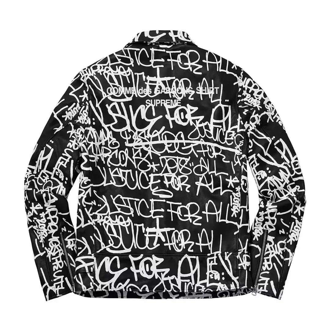 This jacket is currently available in black leather with white graffiti designs as part of the Supreme and Comme des Garçons collaboration.
