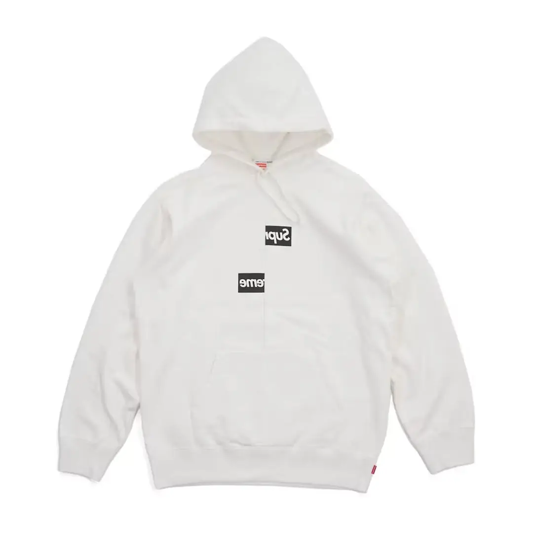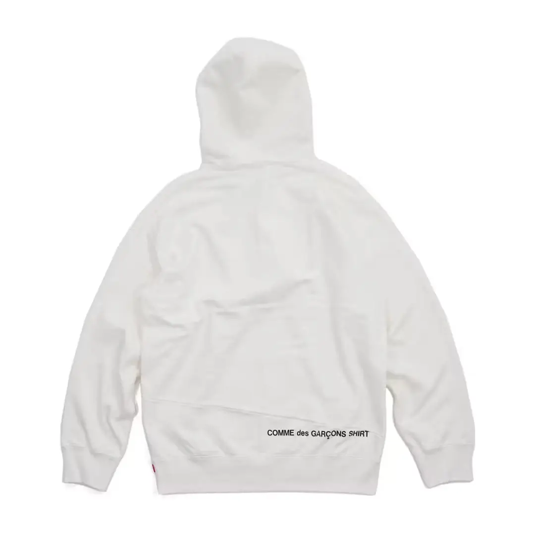 The Supreme x Comme des Garçons Split Box Logo Hooded Sweatshirt features the iconic Supreme box logo reversed and split down the center. A contrast stitch runs vertically from the kangaroo pocket to the collar, dividing the logo into two halves for a bold, deconstructed look.